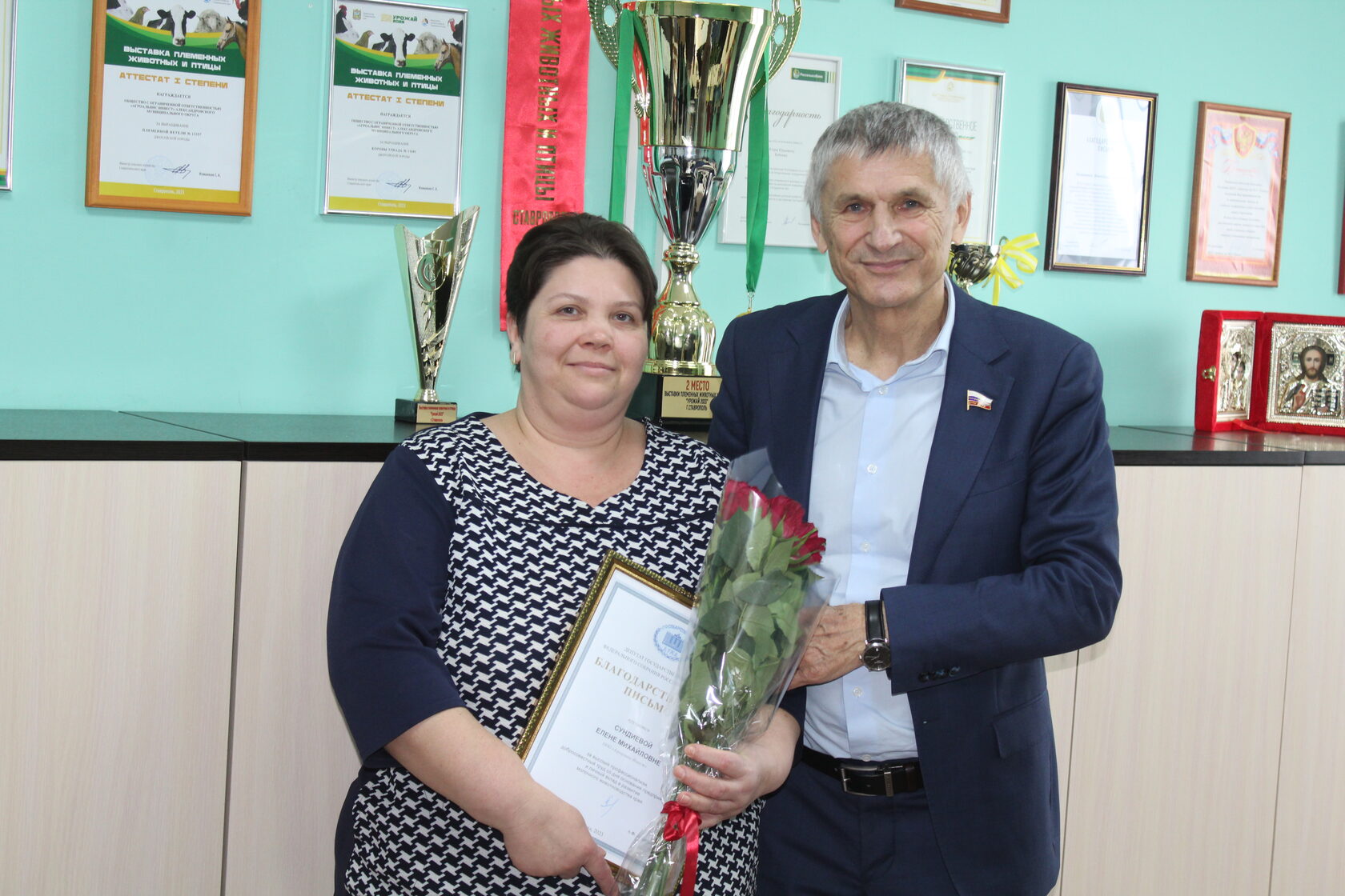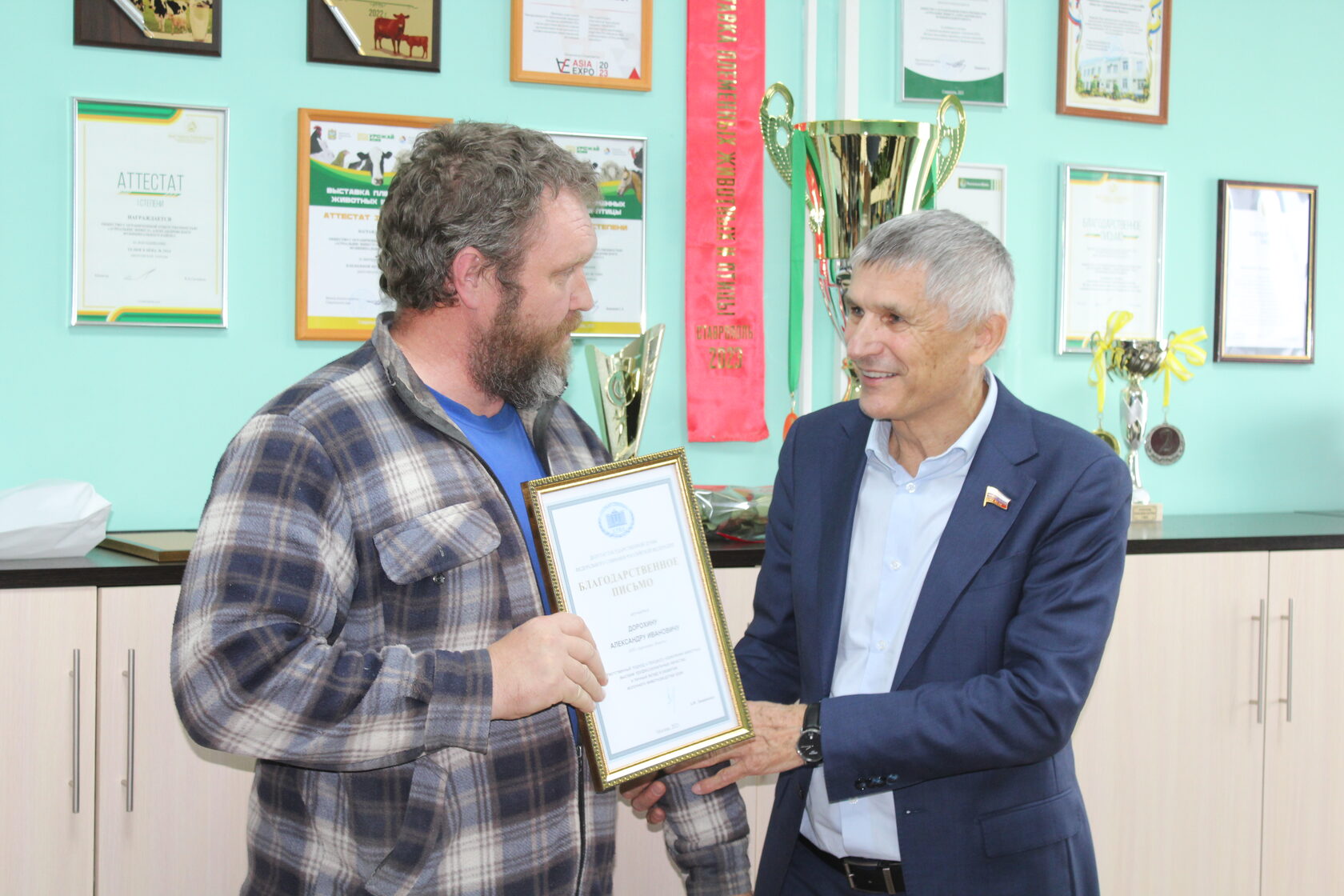 После встречи со школьниками Лавриненко А.Ф. посетил животноводческий комплекс с. Калиновское. Целью визита было знакомство с производством и коллективом предприятия. С главными специалистами ООО «Агроальянс Инвест» были обсуждены актуальные вопросы отрасли животноводства, такие как обязательная сертификация поступающего в Россию импортного биоматериала для воспроизводства и другие важные темы. Депутат получил обратную связь от отрасли, которая поможет в формировании аграрной политики России. После встречи Лавриненко А.Ф. наградил благодарностями Государственной Думы Российской Федерации работников ООО «Агроальянс Инвест».